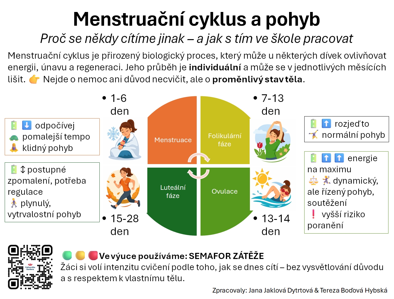 Cílem posterů není sledovat menstruační cyklus žákyň ani zasahovat do jejich soukromí, ale nabídnout srozumitelný rámec, který vysvětluje, proč se může tělo v různých dnech cítit jinak, a jak s tím lze ve výuce pracovat bez vylučování z pohybu.